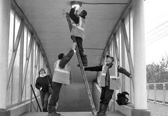 ¿Qué hay de malo en esta imagen? Hay un grupo de electricistas trabajando inadecuadamente en una escalera, están poniendo en peligro a su compañero por el procedimiento inseguro que están haciendo para realizar la tarea.