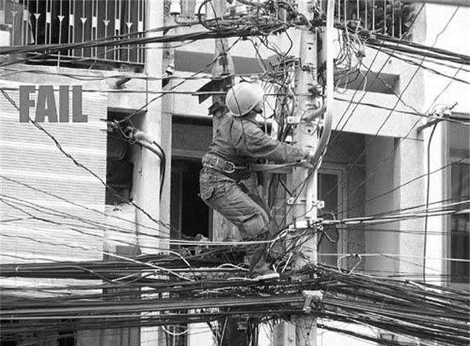¿Qué hay de malo en esta foto? Hay un electricista trabajando en contacto directo con líneas eléctricas expuestas.