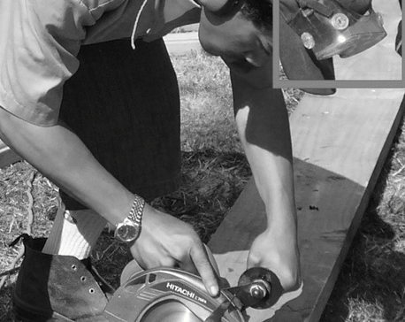 ¿Qué hay de malo en esta foto? El trabajador que utiliza la sierra circular tiene unas gafas perfectamente adecuadas para proteger sus ojos de los restos que salen despedidos. Lástima que las tenga enrolladas alrededor de su gorra de béisbol en lugar de sobre los ojos.