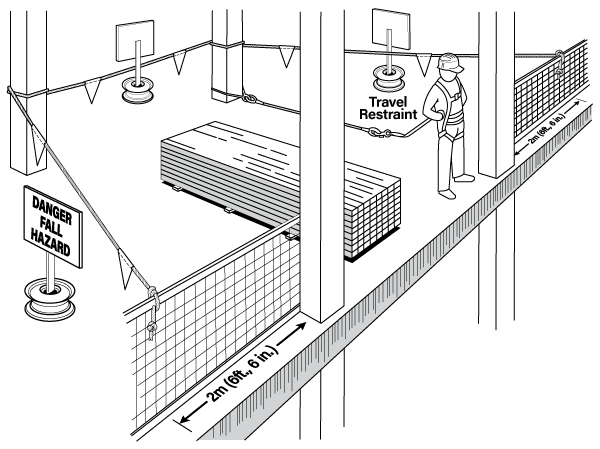 After the guardrail is removed, everyone working inside the marked off area must use a travel restraint or fall arrest system at all times.