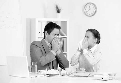 What’s wrong in this picture? There are two office workers that are suffering flu illness on the worksite and they are being a potential individual to spread this illness to others easily. Flu is potentially a serious respiratory illness that can cause missed work, hospitalization, and, in some cases, even death.