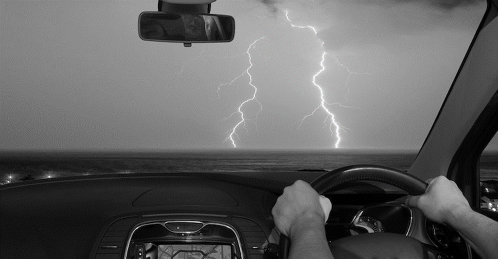 The driver clearly miscalculated by being in a position where he is driving in a dangerous lightning storm. He either miscalculated being on the road by not following weather reports, or decided to drive despite weather reports of lighting.