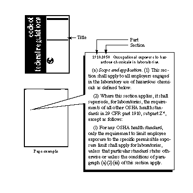 Sometimes it requires a little research to obtain information from the CFRs. A typical OSHA reference may include the title, part, section, paragraph and sub-paragraph numbers. For example, 29 CFR 1910.1450(a)(2)(i), reads as Title 29, CFR, Part 1910, Section 1450, Paragraph (a), Subparagraph (2) (i). To help you better understand the organization of the CFRs, the following is an excerpt from 29 CFR 1910.1450:
